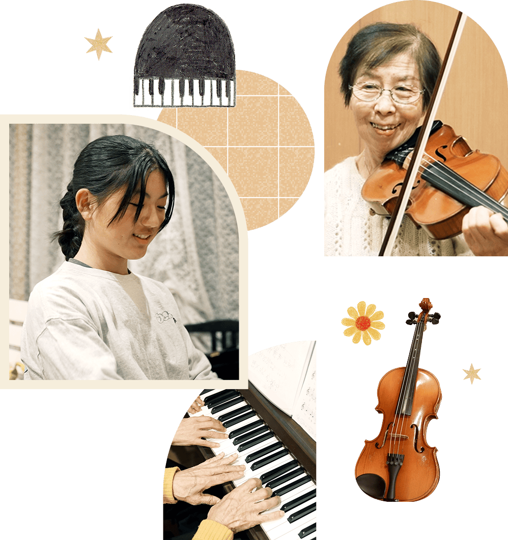 小さなお子さまからシニア世代の方まで幅広く対応!バイオリンとピアノ、どちらも学べる環境が整っています。