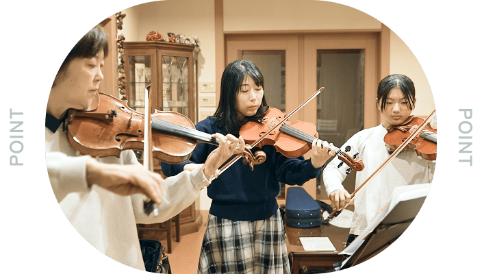 決まった型にとらわれず、年齢や経験に合わせて内容を調整!バイオリンもピアノも楽しみながら基礎を大切に育てます。